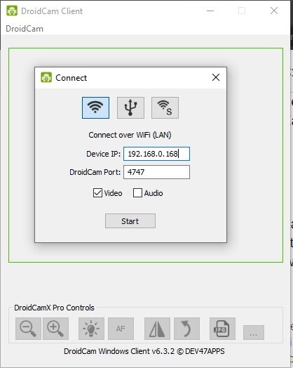 -En la pantalla principal de la aplicación en el teléfono, aparecerá el IP de tu teléfono. Ingresa ese código en la ventana de la aplicación DroidCam de escritorio.